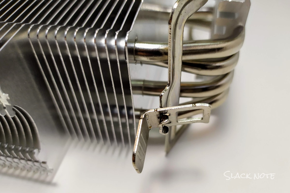 ヒートシンクは銅製のパイプとアルミ製のフィンを組み合わせて作られている。熱伝導率が高いヒートパイプはヒートシンクから曝露しているので CPU と直接接触する。これを知らずに購入したので儲けものだった。虎徹も同様にパイプに銅が使われていたが、アルミのヒートシンクの中を通っていたのでこちらの方が熱伝導率は高そうだ。